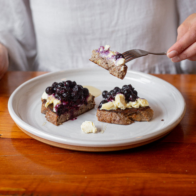 Our Fig & Walnut Sourdough is the perfect base for this French toast recipe – topped with layers of creamy ricotta, a quick stewed blueberry sauce, and a drizzle of honey.