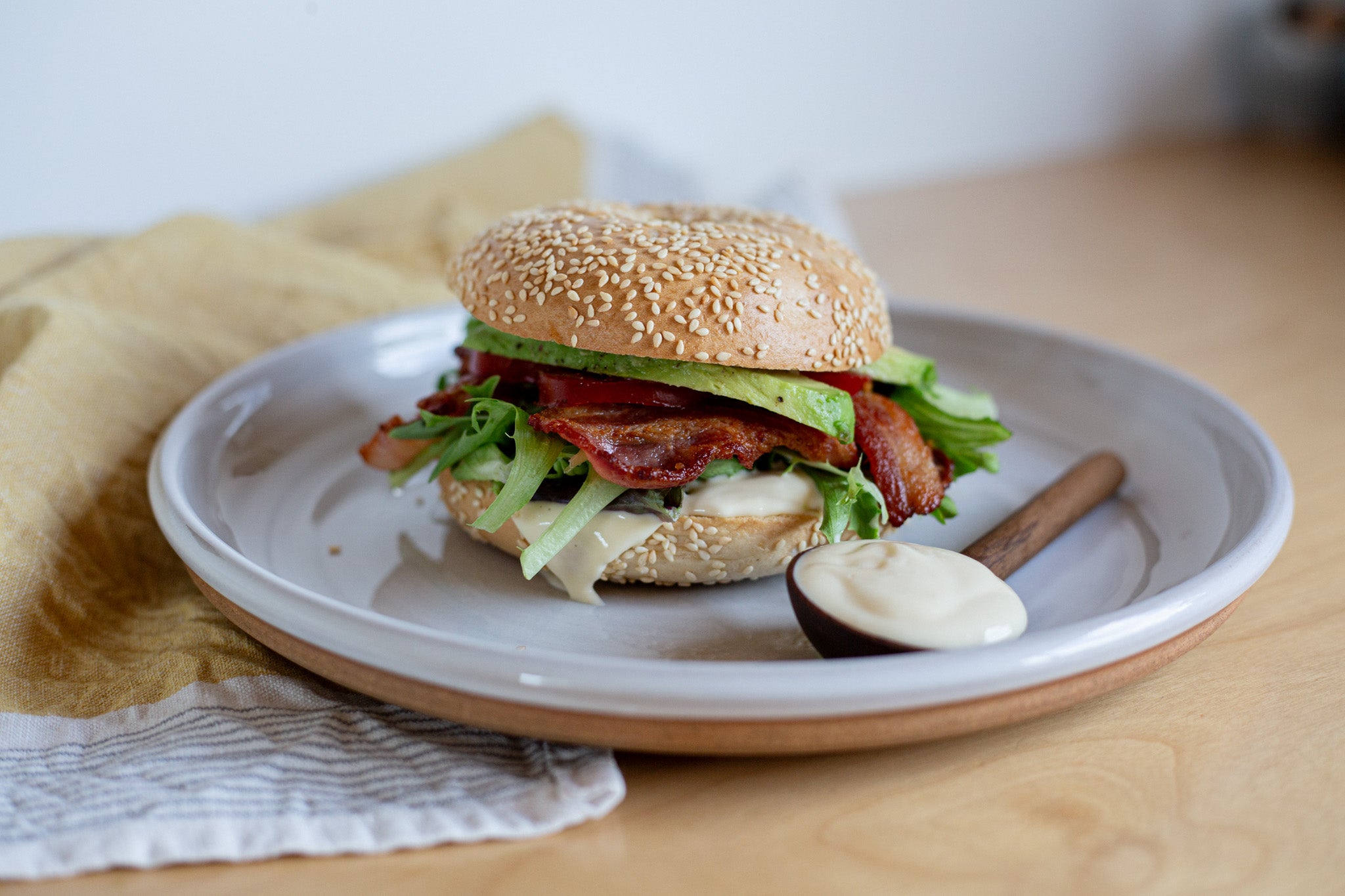 - Spread a generous amount of mayonnaise on bottom half of the bagel.
