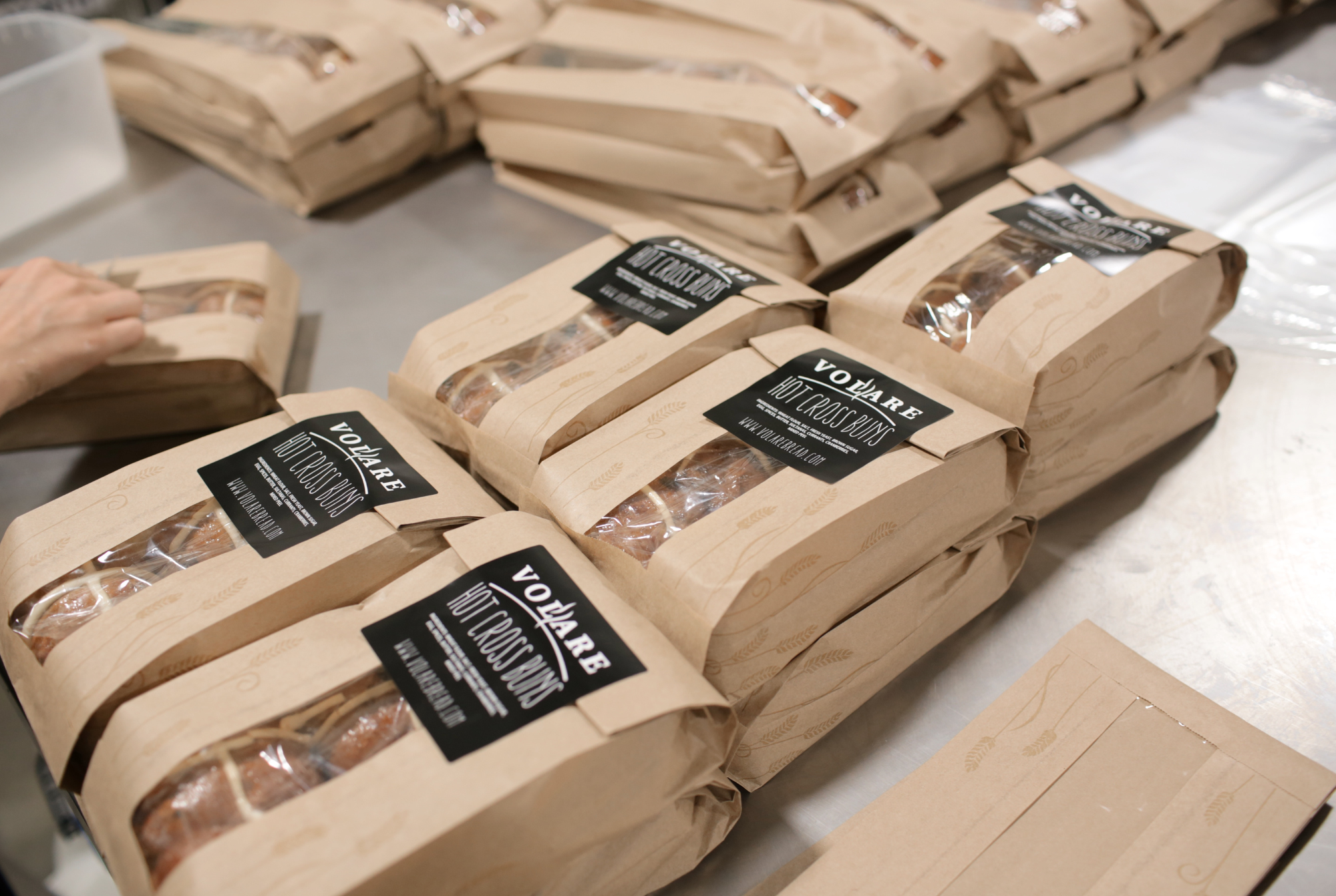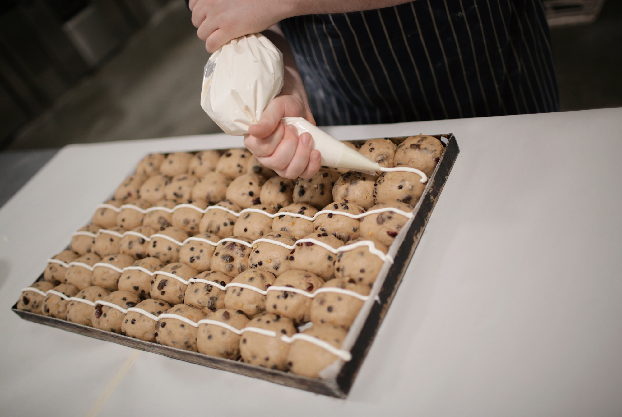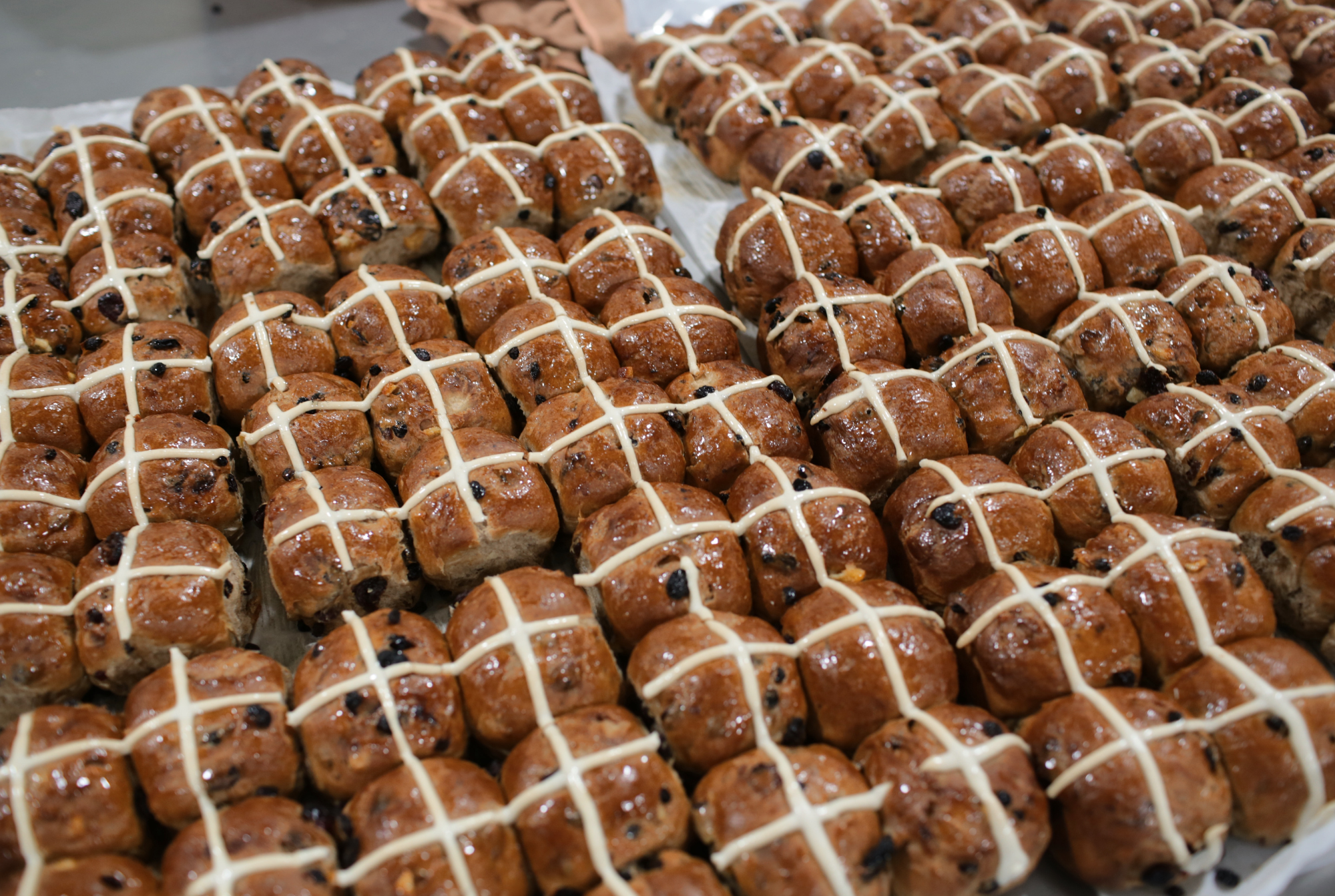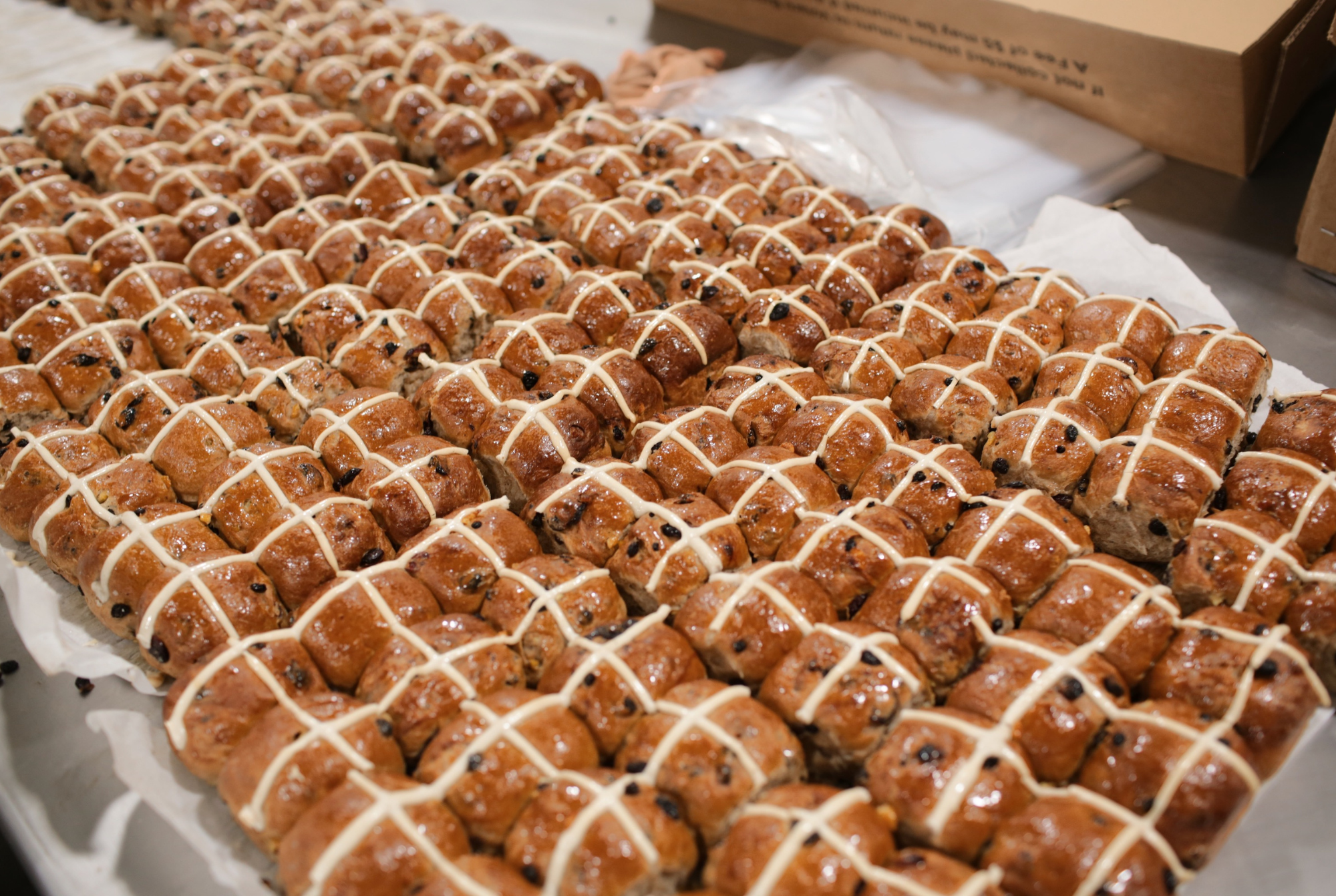 Volare’s award-winning Hot Cross Buns are back for another season and, as always, they’re packed with dried fruit and our unique blend of spices. Made from scratch, iced by hand, and carefully packed, they’re an Easter favourite with our customers. Made with a fermented brioche dough, they’re both springy and moist, finished with a sticky glaze for a truly decadent treat. Best eaten toasted with a generous helping of butter melted on top. Check out some photos from behind the bake below: