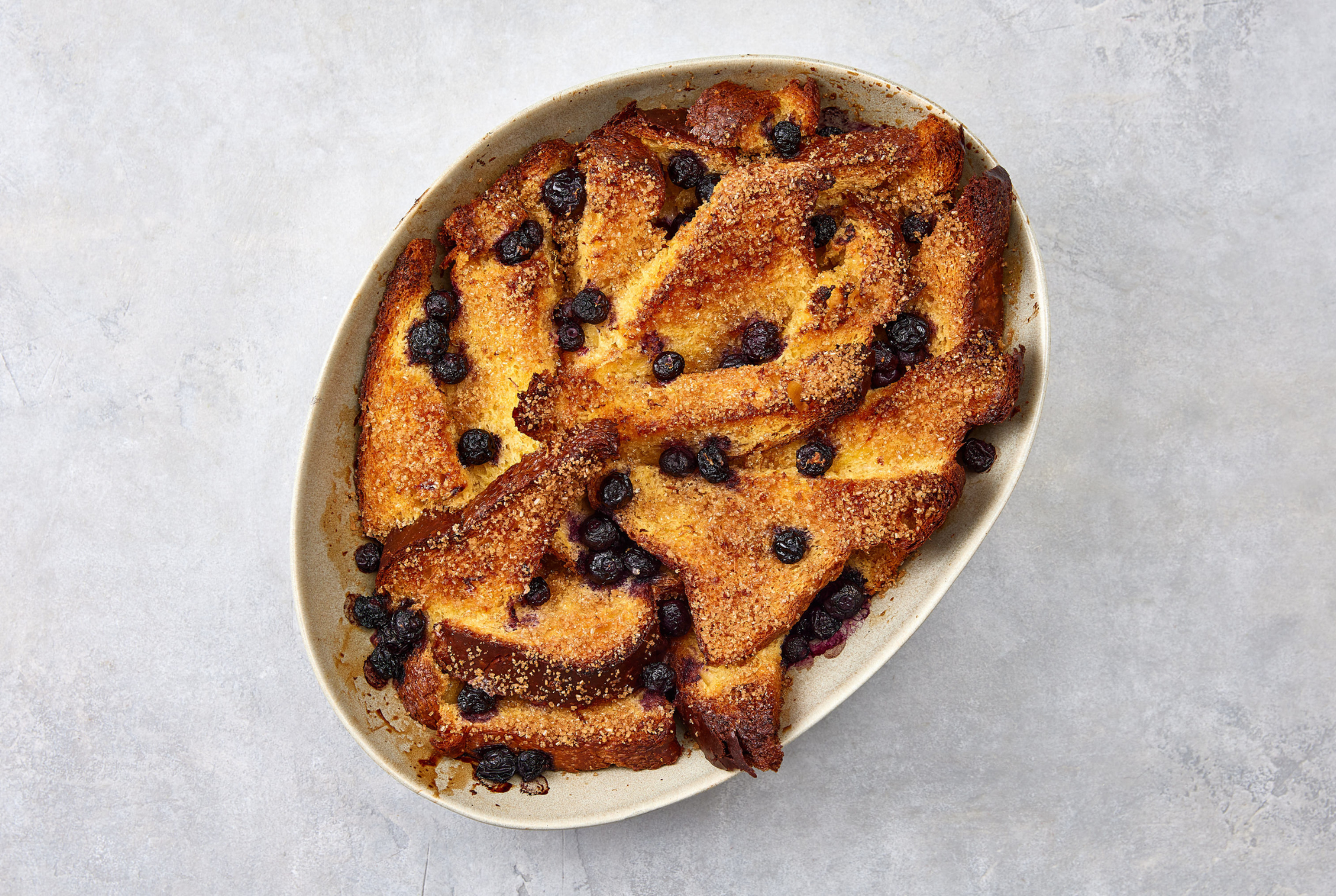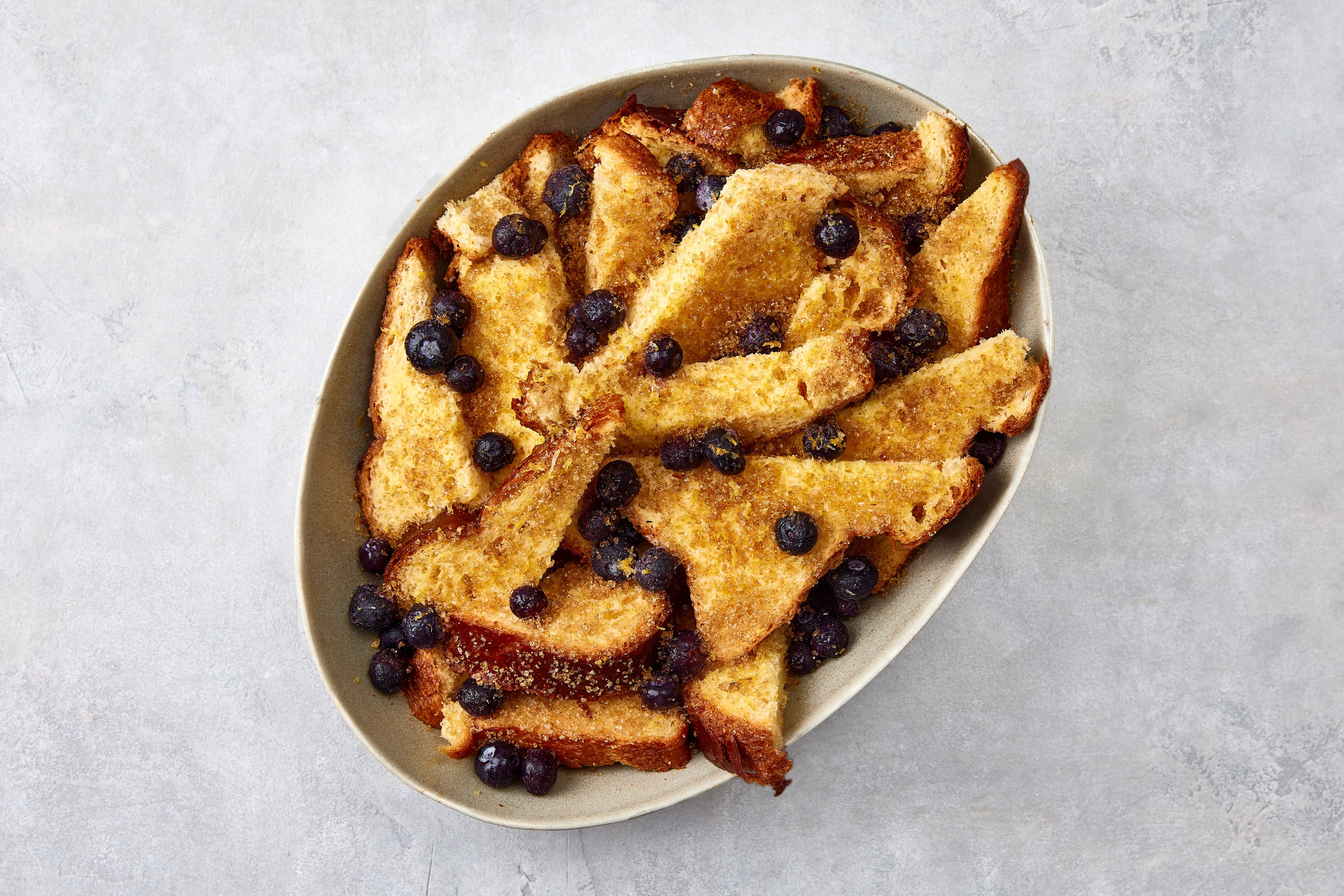 - Layer the remaining bread slices overlapping and scatter the rest of the blueberries evenly on top.