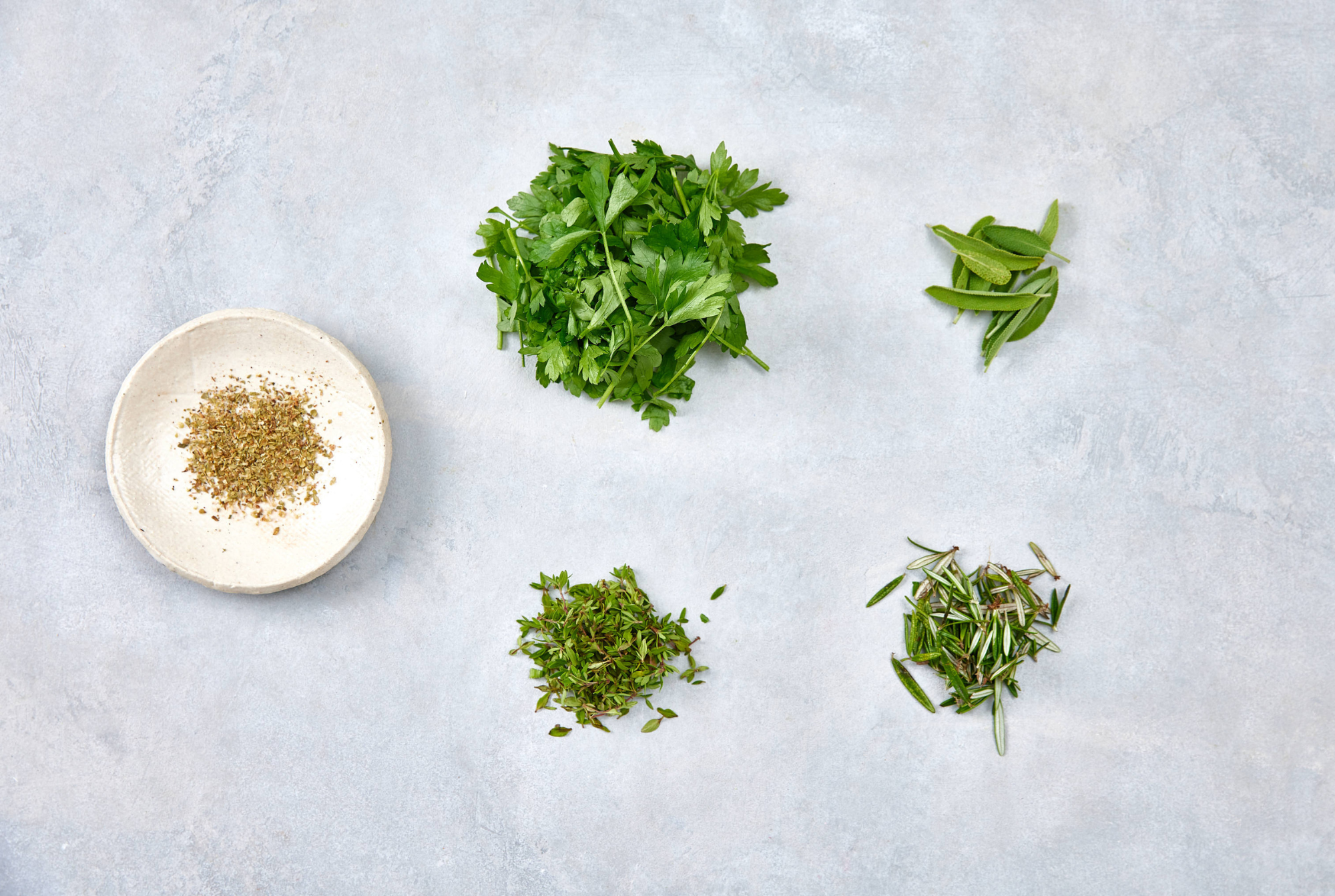 - Combine all herbs on a chopping board. (Parsley, rosemary, thyme, sage, oregano). Roughly chop up. Add to bread bowl, stir through with salt and pepper. Add half of the chicken stock to the bread mix. Fold through.