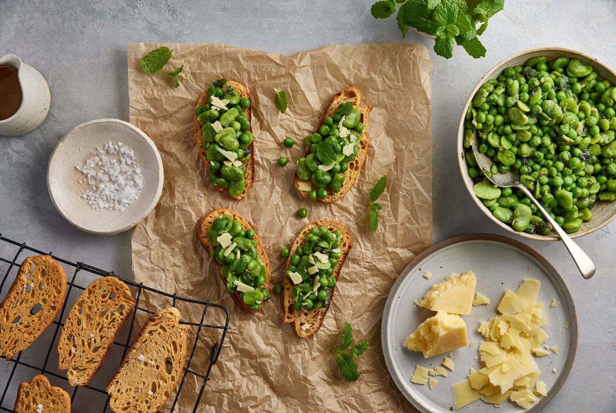 - To serve, toast slices of Ciabatta or use prepared Crostini. Top with the warm pea and broad bean mix, Parmesan cheese and extra mint leaves to garnish.