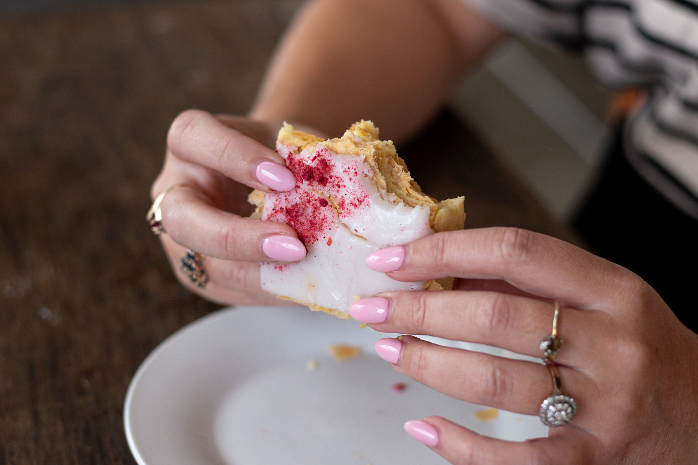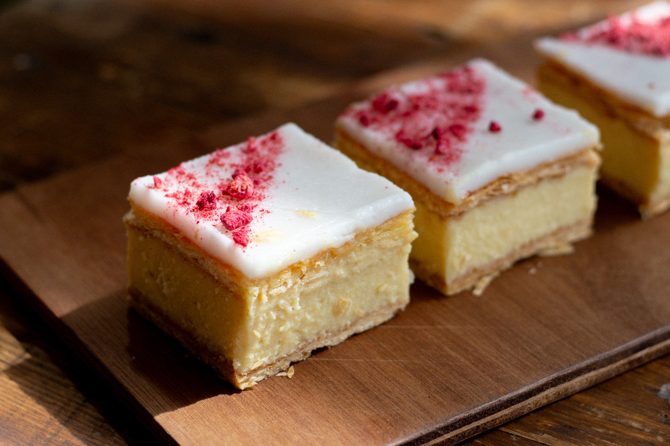 It starts with the making of our signature puff pastry using the French method. With just four simple ingredients – flour, salt, butter, and water – we create a pastry that is light, flaky, and utterly irresistible. Over the course of three days, we meticulously fold and layer the dough, building up over 250 delicate layers that form the foundation of our custard squares.